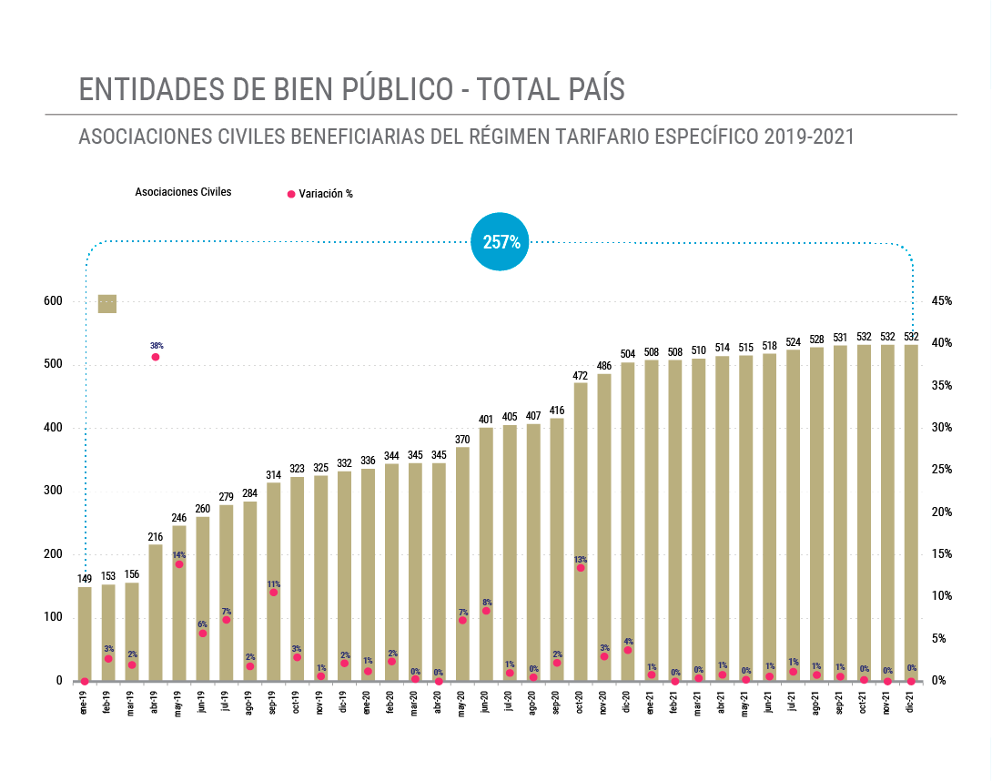 En ese sentido, vale destacar que en diciembre de 2020 se habían registrado 504 asociaciones, mientras que en el mismo mes de 2021 la cifra se elevó a 532. Como dato adicional, entre enero de 2019 y diciembre de 2021, las Asociaciones Civiles con acceso a la tarifa diferenciada crecieron un 257%, si se toma en cuenta que al inicio de este período se contabilizaba un total de 149 entidades.