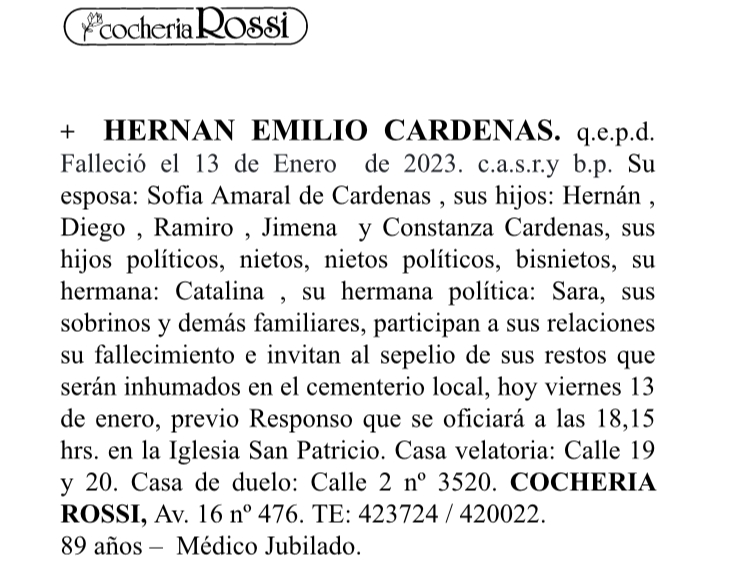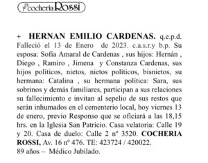Necrológicas Updated: 13 enero, 2023 + HERNAN EMILIO CARDENAS. q.e.p.d. By redaccion 13 enero, 2023 225 0 Cuota FacebookTwitterPinterestWhatsApp Mas leidas Mercedesredaccion - 22 abril, 2026Capacitación gratuita sobre Procesos de Familia Nacionalesredaccion - 22 abril, 2026ARCA estableció nuevos cambios en Ganancias Mercedesredaccion - 22 abril, 2026No solo en Mercedes, en Provincia más de 600 amenazas de tiroteos y peleas en escuelas redaccion Cuota FacebookTwitterPinterestWhatsApp Artículo anteriorMIGUEL GREGORIO ROSEMBERG Q.E.P.D.Artículo siguienteTRES AÑOS SIN FERNANDO - Advertisement - DEJA UNA RESPUESTA Cancelar respuesta Comentario: Por favor ingrese su comentario! Nombre:* Por favor ingrese su nombre aquí Correo electrónico:* ¡Has introducido una dirección de correo electrónico incorrecta! Por favor ingrese su dirección de correo electrónico aquí Sitio web: Guardar mi nombre, correo electrónico y sitio web en este navegador la próxima vez que comente. Δ Este sitio usa Akismet para reducir el spam. Aprende cómo se procesan los datos de tus comentarios. - Publicidad - Ultimas noticias Mercedesredaccion - 22 abril, 2026Capacitación gratuita sobre Procesos de FamiliaSOCIEDAD El Colegio de Magistrados y Funcionarios junto al Colegio de Abogados del Departamento Judicial de Mercedes anunciaron la realización... Nacionales ARCA estableció nuevos cambios en Ganancias redaccion - 22 abril, 2026 Mercedes No solo en Mercedes, en Provincia más de 600 amenazas de tiroteos y peleas en escuelas redaccion - 22 abril, 2026 Mercedes Mahiques integró la comitiva oficial de Milei en Israel redaccion - 22 abril, 2026 Provinciales Kicillof participó de actos en homenaje al Papa Francisco redaccion - 21 abril, 2026 - Publicidad - Te puede gustar tambien Julio Roberto Zazzali Q.E.P.D. Necrológicas redaccion - 13 febrero, 2025 IRENEO NORBERTO PEDRAZZA. q.e.p.d. Necrológicas redaccion - 7 enero, 2025 JORGE OSCAR MARTIN Q.E.P.D. Necrológicas redaccion - 13 enero, 2024 ROBERTO OSCAR GARAVANO Q.E.P.D. Necrológicas redaccion - 12 enero, 2024 - Publicidad -