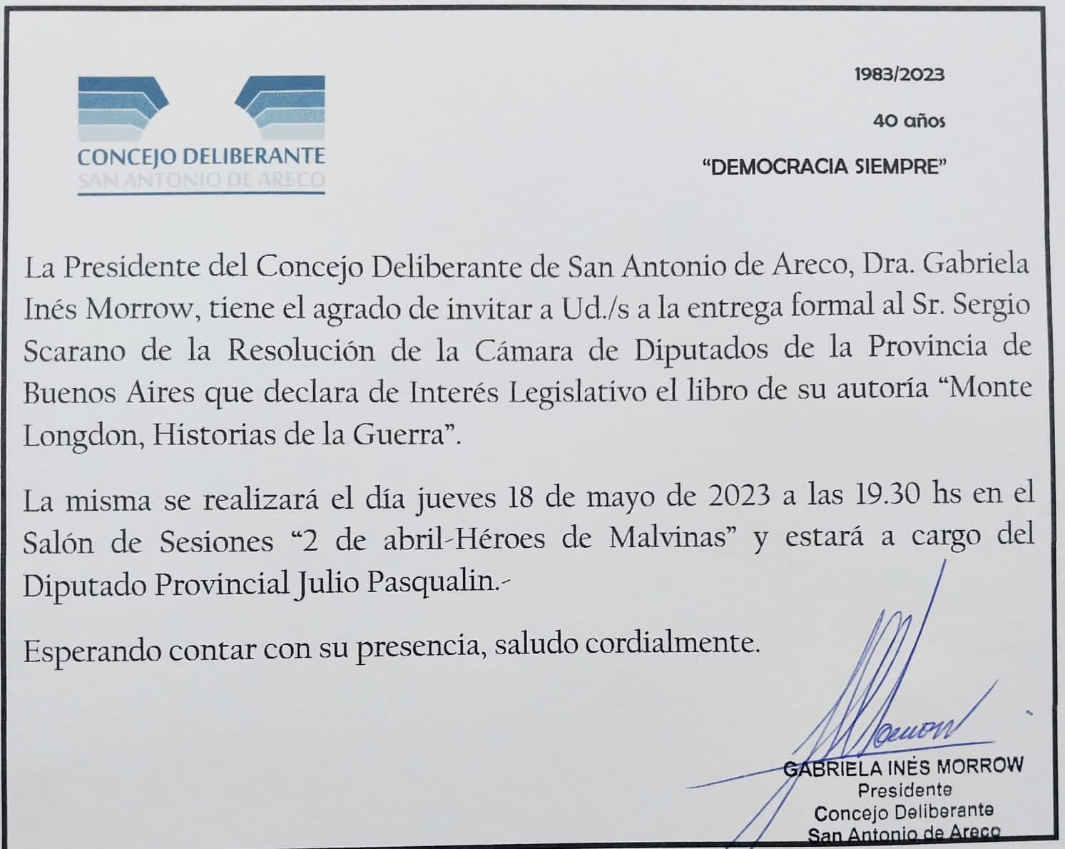 Este jueves 19.30 horas los esperemos para compartir junto a nuestro héroe , ex combatiente Sergio Scarano un reconocimiento más a su gran tarea de malvinización, alusivo a su libro “Monte Longdon”.