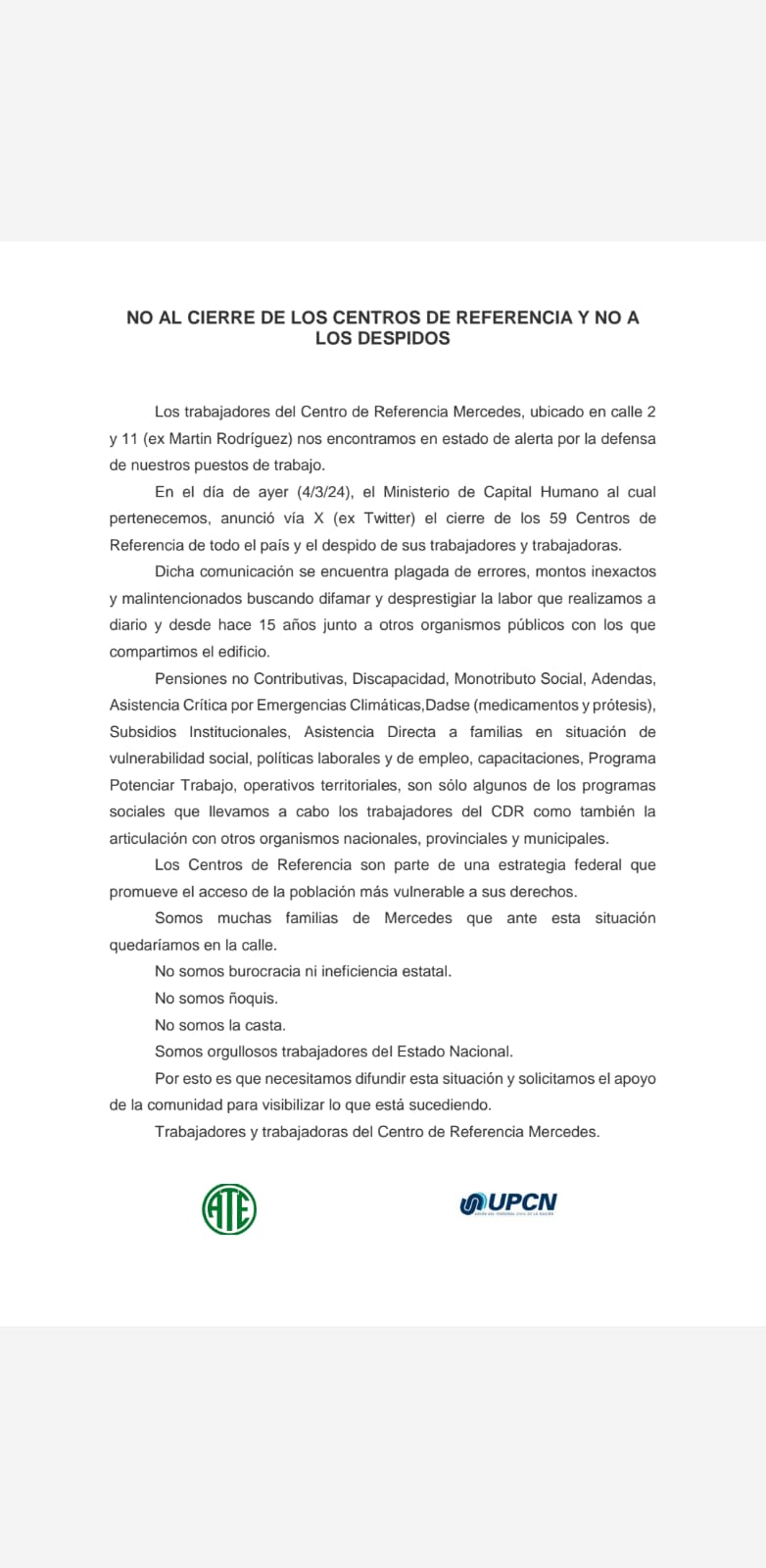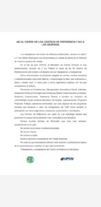 Mercedes Updated: 5 marzo, 2024 No al cierre de los centro de referencia y no a los despidos By redaccion 5 marzo, 2024 152 0 Cuota FacebookTwitterPinterestWhatsApp Mas leidas Nacionalesredaccion - 23 abril, 2026Villarruel se diferenció del Gabinete nacional Sin categoríaredaccion - 23 abril, 2026La ANSV solicitió la inhabilitación de la licencia de Santiago Maratea por conducción imprudente Mercedesredaccion - 23 abril, 2026Allanan vivienda de un adolescente tras amenaza en una escuela redaccion Cuota FacebookTwitterPinterestWhatsApp Artículo anteriorDeclaraciones Axel Kicillof Apertura de SesionesArtículo siguienteBanco Provincia volvió a lanzar 12 cuotas sin interés en su tienda virtual - Advertisement - DEJA UNA RESPUESTA Cancelar respuesta Comentario: Por favor ingrese su comentario! Nombre:* Por favor ingrese su nombre aquí Correo electrónico:* ¡Has introducido una dirección de correo electrónico incorrecta! Por favor ingrese su dirección de correo electrónico aquí Sitio web: Guardar mi nombre, correo electrónico y sitio web en este navegador la próxima vez que comente. Δ Este sitio usa Akismet para reducir el spam. Aprende cómo se procesan los datos de tus comentarios. - Publicidad - Ultimas noticias Nacionalesredaccion - 23 abril, 2026Villarruel se diferenció del Gabinete nacionalPOLÍTICA Tras ausentarse en el homenaje al Papa en Luján, la vicepresidenta eligió otro acto y lanzó su respuesta, profundizando... Sin categoría La ANSV solicitió la inhabilitación de la licencia de Santiago Maratea por conducción imprudente redaccion - 23 abril, 2026 Mercedes Allanan vivienda de un adolescente tras amenaza en una escuela redaccion - 23 abril, 2026 Mercedes Capacitación gratuita sobre Procesos de Familia redaccion - 22 abril, 2026 Nacionales ARCA estableció nuevos cambios en Ganancias redaccion - 22 abril, 2026 - Publicidad - Te puede gustar tambien Allanan vivienda de un adolescente tras amenaza en una escuela Mercedes redaccion - 23 abril, 2026 Capacitación gratuita sobre Procesos de Familia Mercedes redaccion - 22 abril, 2026 No solo en Mercedes, en Provincia más de 600 amenazas de tiroteos y peleas en escuelas Mercedes redaccion - 22 abril, 2026 Mahiques integró la comitiva oficial de Milei en Israel Mercedes redaccion - 22 abril, 2026 - Publicidad -